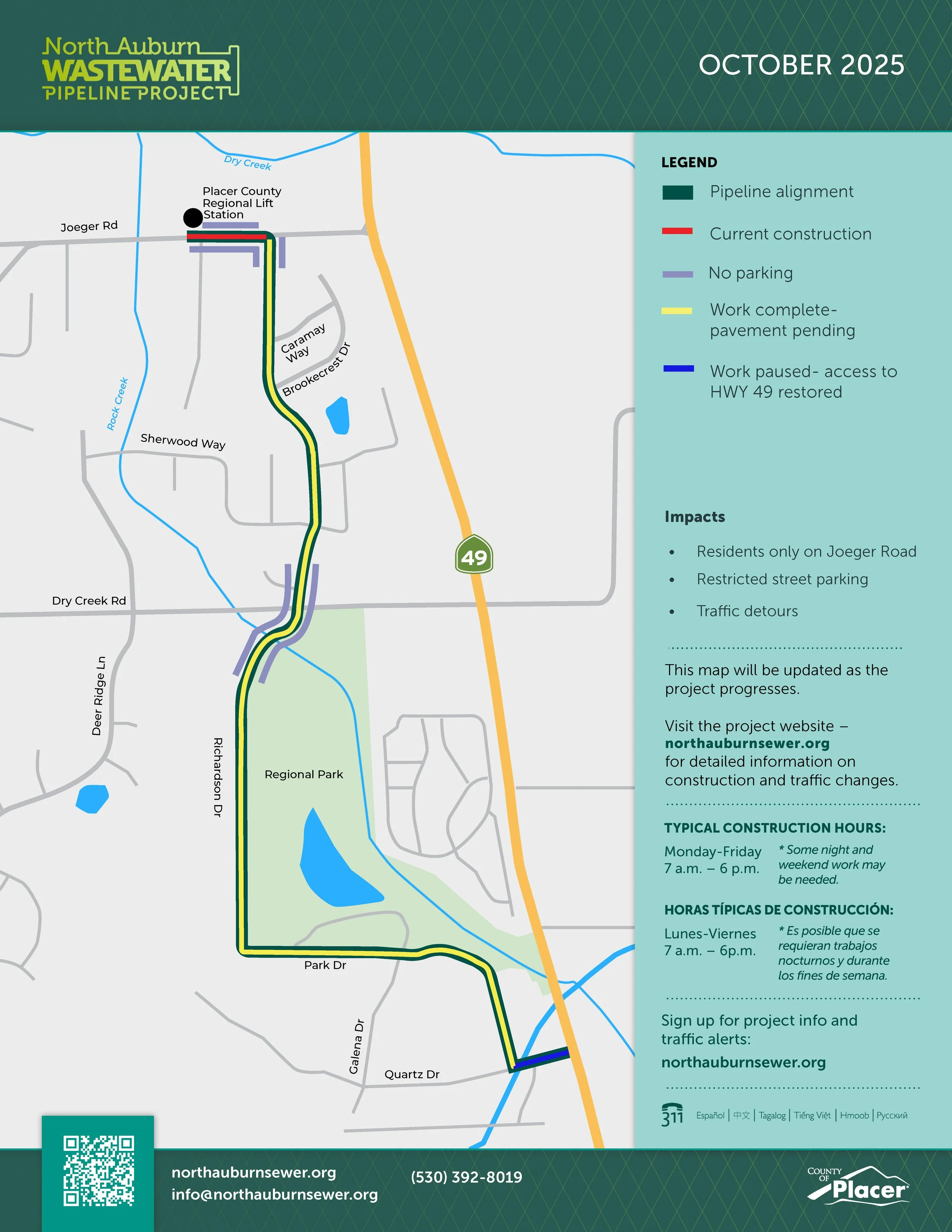 Joeger Road Work: Pipeline installation continues until late October. Joeger Road between Richardson Drive and the Placer County Regional Lift Station is closed to through traffic - please use alternate routes.